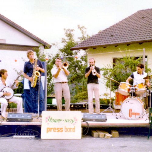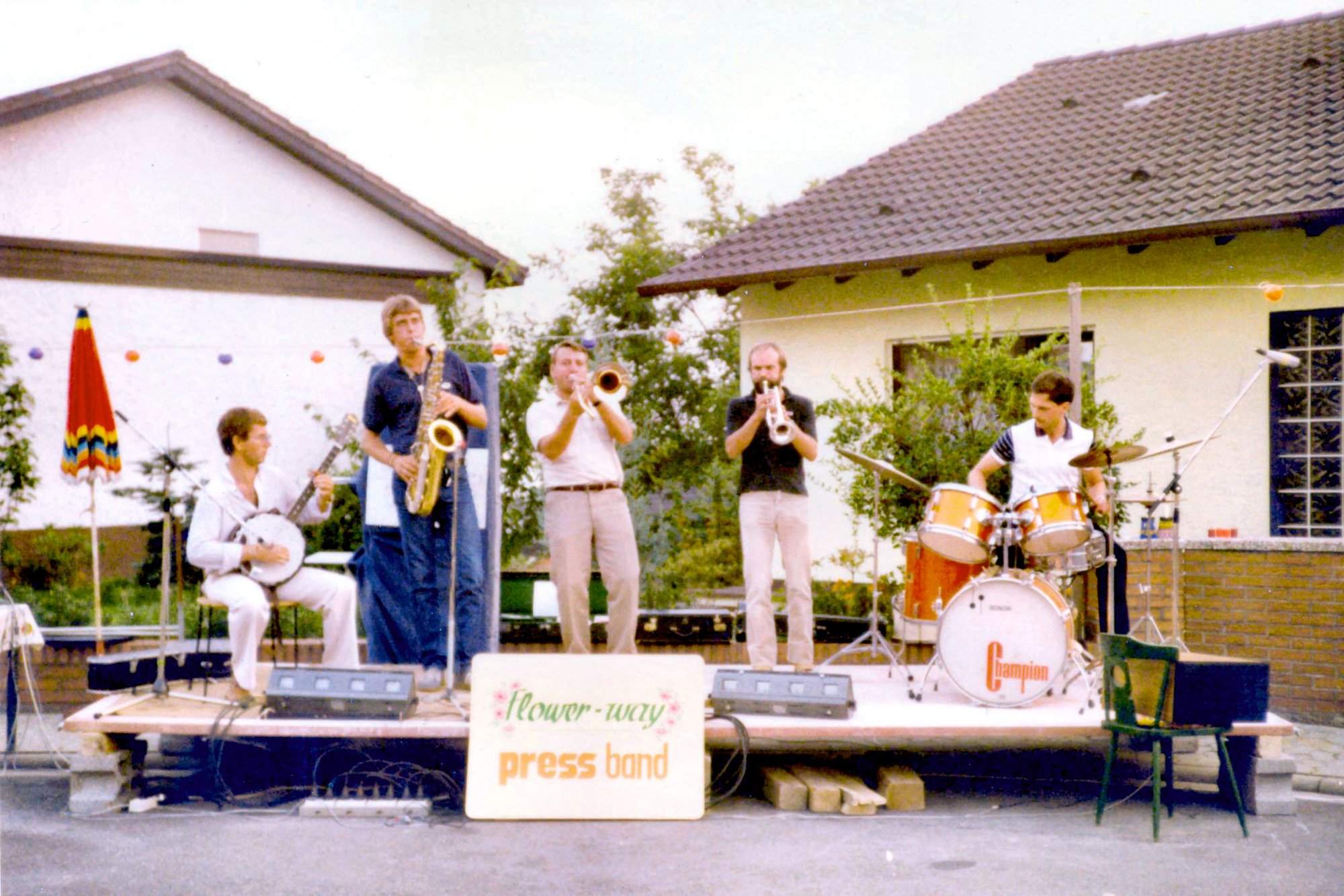 Durch das Gespräch zweier Nachbarn (Dr. Siegfried Kintopf und Dr. Bruno Weis) im Blütenweg entstanden 1979 die ORIGINAL BLÜTENWEG-JAZZER, die zu dieser Zeit noch unter den "markanten" Namen "Flowerway Press Band" bzw. "Flowerway Brass Band" auftraten. Das nebenstehende Bild zeigt: Harald Büttner am Schlagzeug, Wolfgang Völker an der Trompete, Dr. Siegfried Kintopf an der Posaune, Markus Jörg am Saxofon und Dr. Bruno Weis am Banjo bei einem Straßenfest im Blütenweg am Samstag, den 15.08.1981. Dieses Foto ist das erste verfügbare Bilddokument von einem öffentlichen Auftritt der Band.