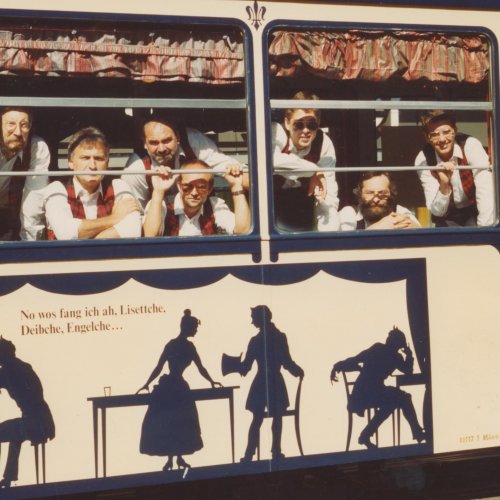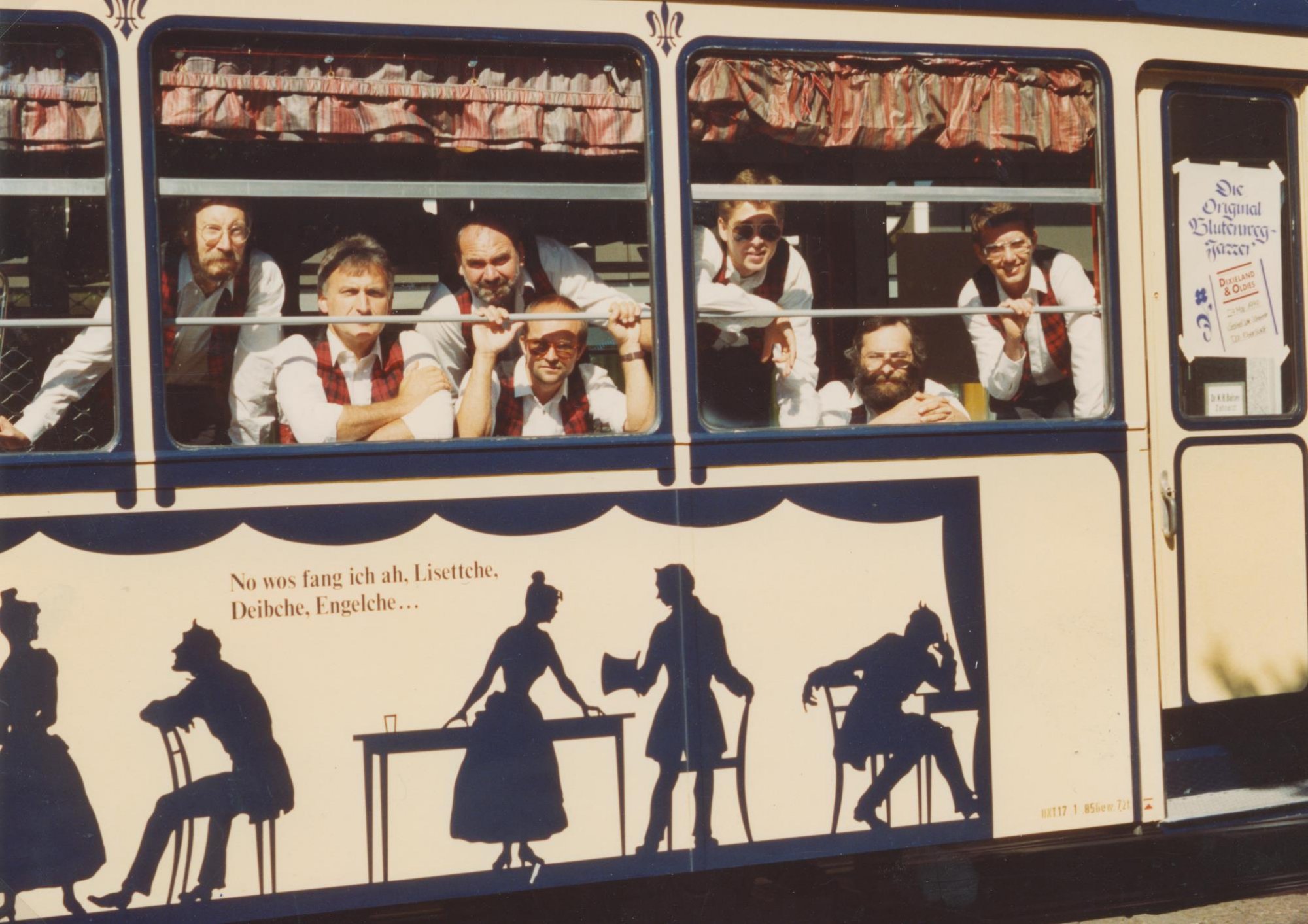 Die Jazzer auf der Fahrt von Bensheim nach Neustadt in der Pfalz in einem historischen Wagen mit einer alten Dampflokomotive am 25.10.1995