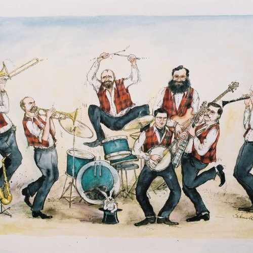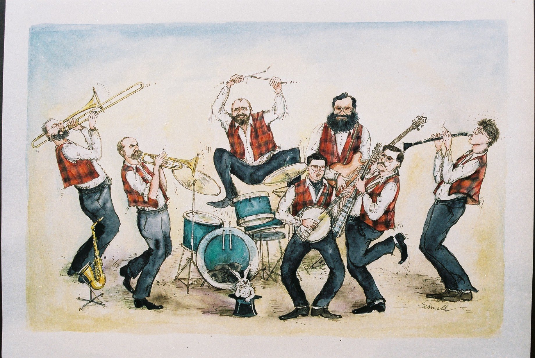 Nachfolgend gibt es eine Bilderstrecke aus der Zeit bis 1992 u.a. mit einem Aquarell von Ursula Schnell. Mit dabei bei diesen Bildern auch die Gastspieler: Charly Andreas am Banjo, Andreas Weiss am Schlagzeug und der leider verstorbene aber unvergessene Ali Lüdeling an der Klarinette und am Saxofon.
