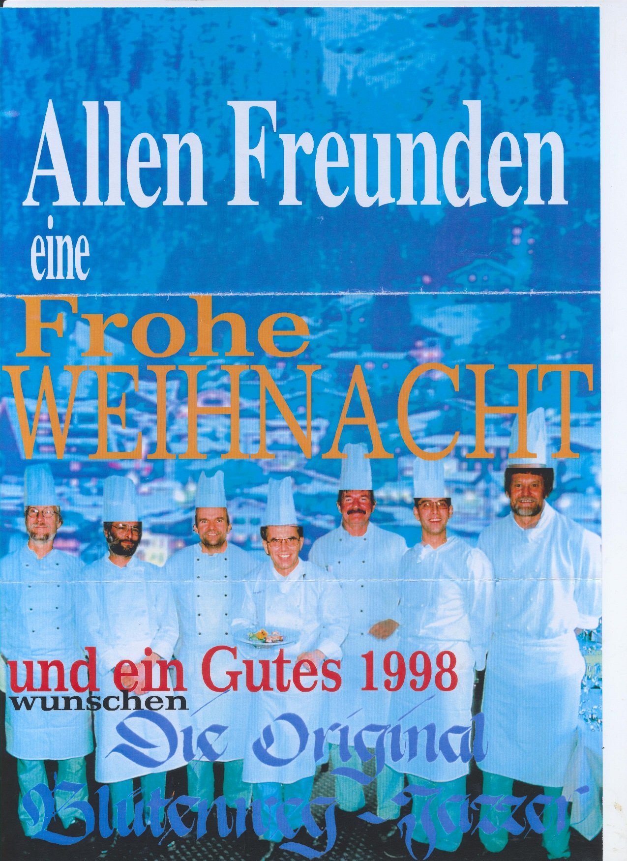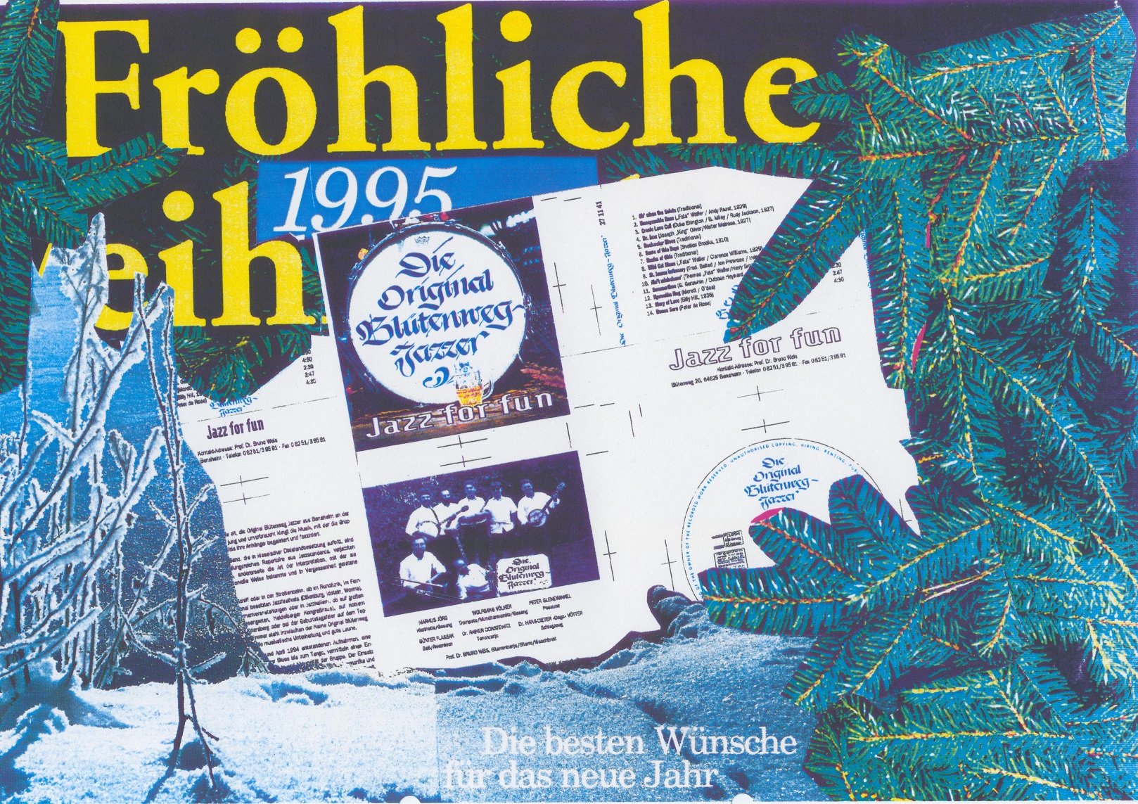 Im Jahr 1994 erschien die erste CD der ORIGINAL BLÜTENWEG-JAZZER mit dem Titel "Jazz for fun". Das ist auch ein Motto der Band, die viel Wert auf Fröhlichkeit und gute Stimmung legt. Eine genaue Beschreibung der CD ist unter dem Button "Shop" zu finden. 1994 war ein Jahr mit über 50 Auftritten u.a. auf dem Wagen Nummer 28 beim Winzerfest in Bensheim und am 04.09. die musikalische Begleitung der Hessischen Landes-Wein- und Sektprämierung am 06.11. im Kloster Eberbach. An Weihnachten 1994 gab es für die Fans die erste Weihnachtspost.