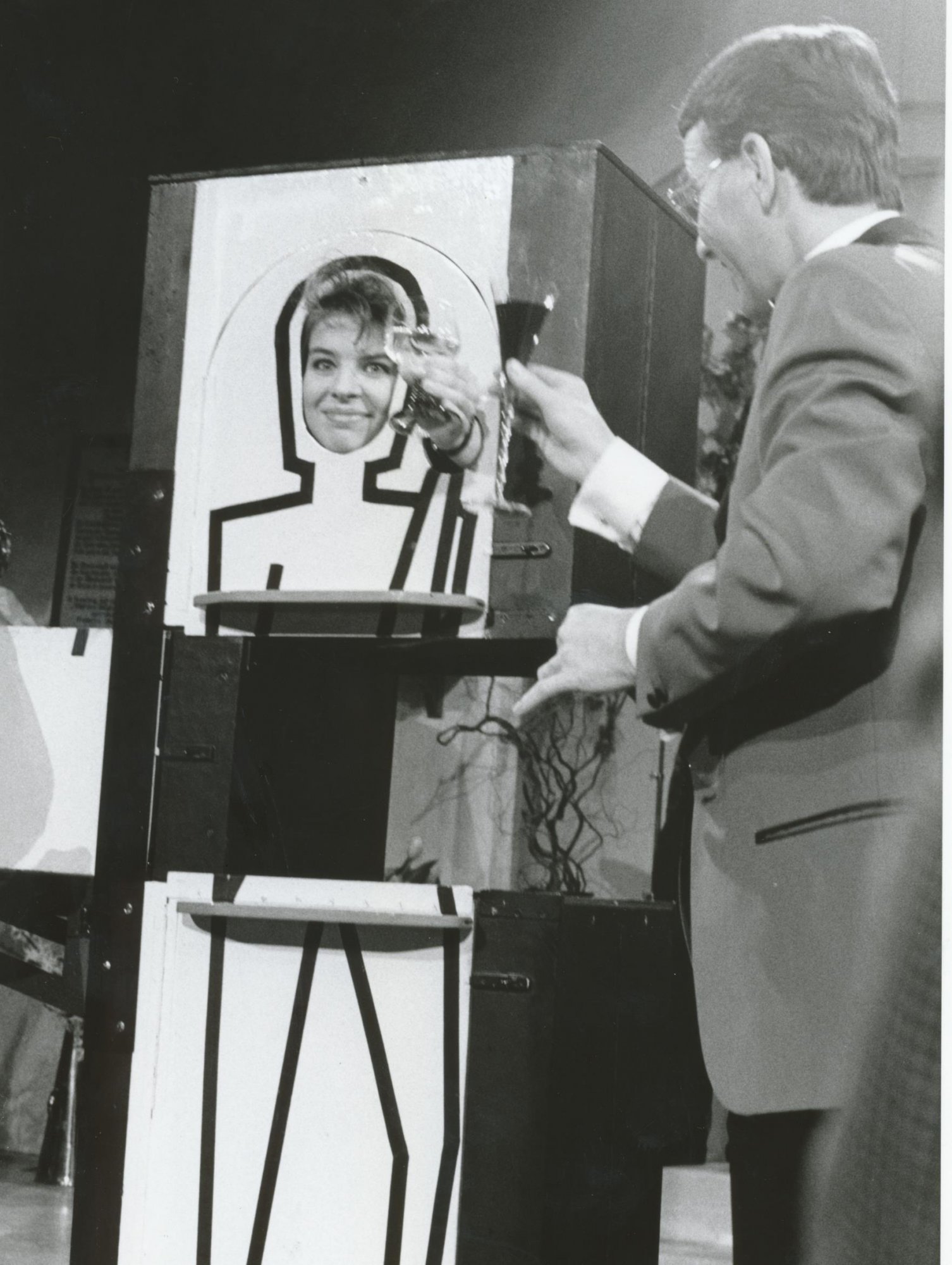 Majestät ohne Mitte: Die Bergsträßer Weinkönigin Sandra Engelhard wird zerteilt in der Fernsehsendung "Der Fröhliche Weinberg" vom 03.01.1996 mit Johann Lafer und Ulrike Neradt